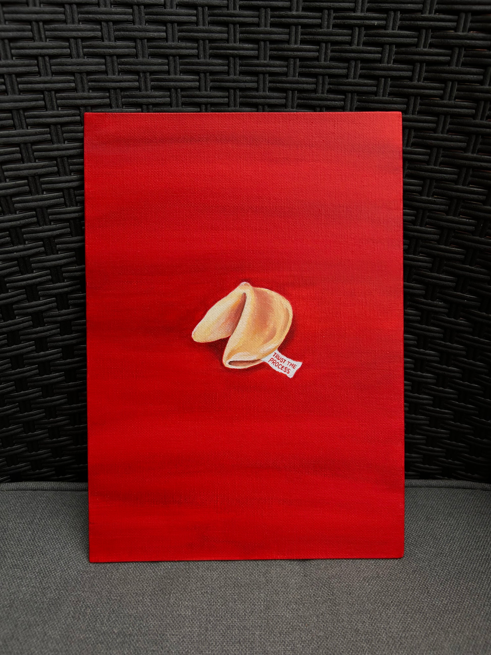 I love fortune cookies which was part of the inspiration for the painting , and I’m currently an artist trying to have it be my full time job so the ‘ trust the process ‘ quote seemed fitting !